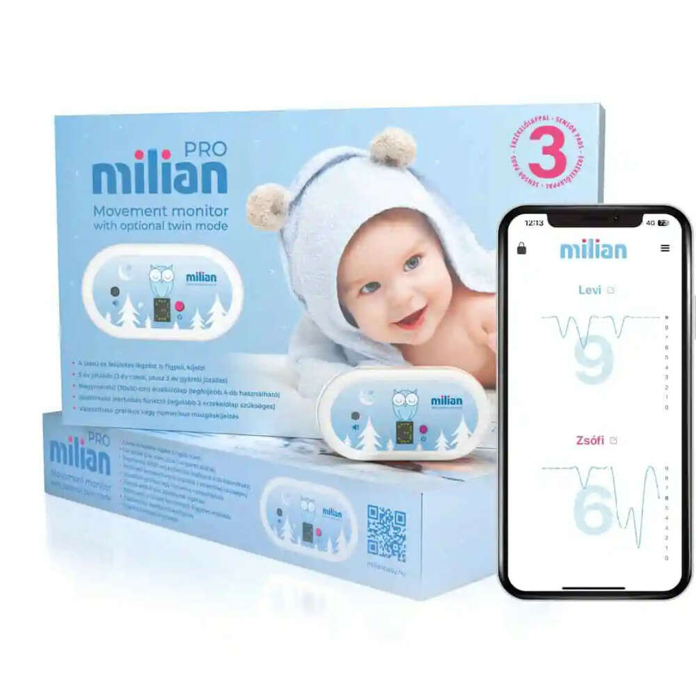 Milian Pro Plus Légzésfigyelő: Nyugodt alvás, biztonságban Ez a Bluetooth-os légzésfigyelő 3 nagyméretű érzékelőlappal (70×140 cm-es kiságyhoz elegendő) gondoskodik babád biztonságáról. Az érzékelőlapok több kiságyra is oszthatók, a központi egység pedig könnyen áthelyezhető. Kiemelt jellemzők: Bluetooth kapcsolat: Az ingyenes Milian applikációval (iOS 9+, Android 9+) valós idejű adatokat kapsz babád mozgásáról és légzéséről. Az előzmények visszanézhetők. Ikerbabás mód is elérhető! Több érzékelőlap: Bővíthető további érzékelőlappal (max. 4), így ikerbabákhoz is tökéletes. Pontos érzékelés: A matracon keresztül is érzékeli a mozgást, bármilyen típusú matracon használható. Biztonsági funkciók: 12 másodperc légzéskimaradás után hangjelzés, 18 másodperc után riasztás. Figyelmeztet a ritka légzésre (kevesebb, mint 10 légzés/perc) és a gyenge légzésre (2,5 percnél hosszabb ideig). Alvásmonitor: Grafikus kijelzés mutatja a baba alvásának minőségét. Hosszú üzemidő: 2 db ceruzaelemmel hónapokig működik (Bluetooth használat esetén az üzemidő rövidebb lehet). Könnyű használat: Egyszerű, egygombos kezelés. 5 év jótállás: 2 év csere + 3 év gyártói jótállás. Milian App funkciói: Normál és ikerbabás grafikon nézet Előzmények visszanézése Sírásfigyelés Folyamatos, halk visszajelzés Bluetooth kapcsolat megszakadás esetén figyelmeztetés Riasztás Fontos: A babaöböl ne érintkezzen a felnőttek ágyával!